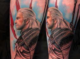 Геральт часто изображается в профиль. В качестве фона может использоваться рисунок чудовища. Некоторые заказывают набивку монстров. Обычно подобные идеи выполняют одним цветом. Чаще чёрным. Монохромность создаёт атмосферу страха и мистики.