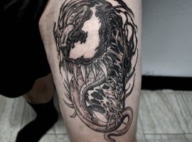 Такие эскизы чаще всего выбирают фанаты Вселенной Марвел и любители оригинальных татуировок. Дословный перевод слова «веном» – «злоба, яд», который как нельзя точно характеризует данного антигероя. Веном не является отдельным существом – это инопланетный паразит, симбиот, для нормального существования которого необходим организм человека.