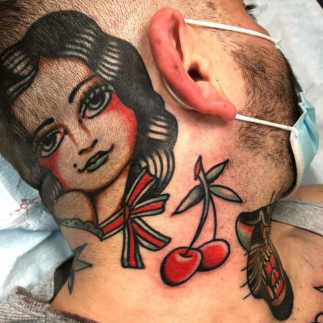 - тату с вишенкой под ключицами. Подобные тату обычно выполняются в стиле реализм или олд-скул и демонстрируют легкий нрав своего обладателя, его любовь к флирту и кокетству.