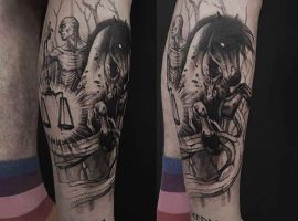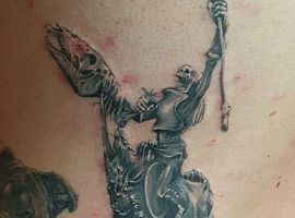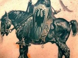 Идеей для татуировки со всадником становится и всадник без головы тоже из одной известной книги. Стоит вспомнить главные черты характера персонажа и легко понять, что будет означать такая татуировка. Герой романа после смерти смог обхитрить своего соперника и заставить его сильно волноваться. Возможно, что человек таким образом заявляет о хитрости, вспыльчивости и чувстве агрессивности, а также и отсутствии страха перед смертью, азартности натуры.