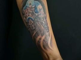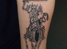 Тату всадник на коне, конечно, нельзя назвать популярным. Но это символ многозначительный и несколько философский. Такая татуировка может указывать как на мужественность и силу, так и на обостренное чувство справедливости, желание всегда занимать лидирующие позиции в обществе. Но в любом случае всадник будет смотреться необычно на теле, привлекая внимание окружающих и заставляя их гадать, что же вы хотели сказать такой тату. Мастера тату салона Альянс с радостью выполнят для вас такую наколку.