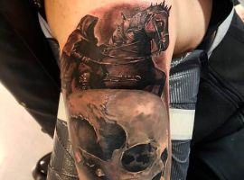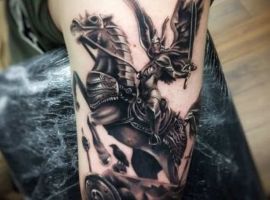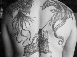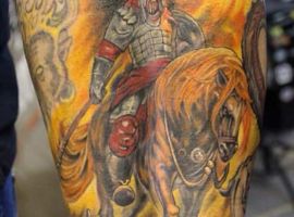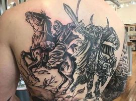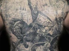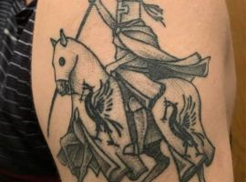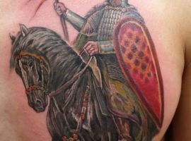 Если же всадник в доспехах скачет на коне и готовиться в битве, к примеру, виднеется выставленное копье или занесенный для удара кинжал, то значение будет совершенно иным. Такая татуировка скорее говорит о стремлении человека властвовать, о его мужественности, силе и даже агрессии по отношении к окружающему миру.