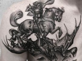 Обычно для выполнения татуировки всадника на коне выбираются масштабные области тела. И это понятно, ведь рисунок сам по себе довольно большой. Если изображать его миниатюрным, то он просто не будет заметен и все детали «сольются». Отлично подойдет тату для области груди, спины, зоны предплечья.