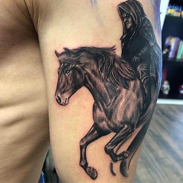 Идеей для татуировки со всадником становится и всадник без головы тоже из одной известной книги. Стоит вспомнить главные черты характера персонажа и легко понять, что будет означать такая татуировка. Герой романа после смерти смог обхитрить своего соперника и заставить его сильно волноваться. Возможно, что человек таким образом заявляет о хитрости, вспыльчивости и чувстве агрессивности, а также и отсутствии страха перед смертью, азартности натуры.