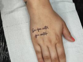Если крупные изображения выбирают девушки смелые, эпатажные, то скромная фраза на малозаметном участке тела подойдет для любой женщины. Она смотрится изящно и эстетично. Надпись легко спрятать от взглядов окружающих с помощью часов, манжеты, браслета, шарфика. Это актуально, если женщина работает там, где положено иметь строгий внешний вид.