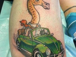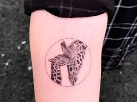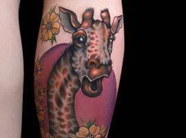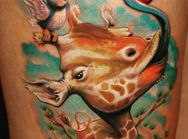 Татуировка с жирафом очень универсальна, она подойдет и мужчине и женщине. Главное, подобрать удачный эскиз и стиль нанесения. Конечно, эффектнее всего смотрятся большие, цветные реалистичные рисунки. Для выполнения такой идеи понадобится большой участок кожи и хороший, опытный тату-мастер.