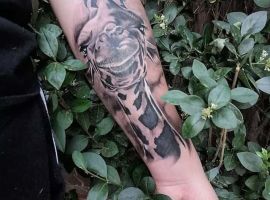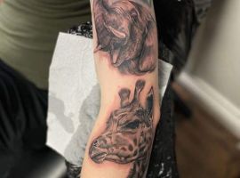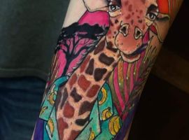 Часто образ жирафа соединяется с другими животными, которых путешественник встречал, например: льва, слона, зебры и тд. В таком случае можно создать уникальную, очень красивую большую тату-композицию. Особенно круто будет смотреться такой рукав.