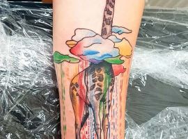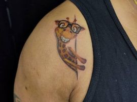 Но также жираф стильно смотрится и в других стилях: графике, акварели, дотворке, в мультяшном виде и др.. Так как животное это уникально, оно будет узнаваемо в любой технике. Часто рисунки с жирафом делают в юморной форме, изображая его, например, в пиджаке или за необычным занятием. Такой вариант выберет человек оригинальный, позитивный и веселый. Разместить на коже такую идею можно где угодно, все зависит от размера рисунка. Продолговатый жираф будет гармонично смотреться на ноге или на руке. Закажите эскиз в салоне Альянс в Киеве.