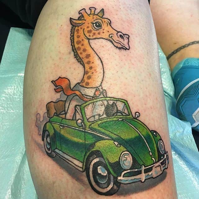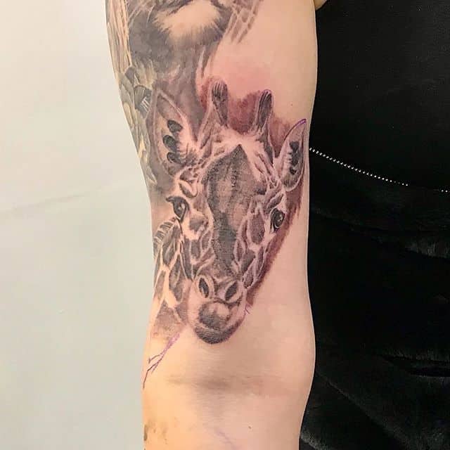 Часто образ жирафа соединяется с другими животными, которых путешественник встречал, например: льва, слона, зебры и тд. В таком случае можно создать уникальную, очень красивую большую тату-композицию. Особенно круто будет смотреться такой рукав.