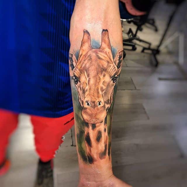 Татуировка с жирафом очень универсальна, она подойдет и мужчине и женщине. Главное, подобрать удачный эскиз и стиль нанесения. Конечно, эффектнее всего смотрятся большие, цветные реалистичные рисунки. Для выполнения такой идеи понадобится большой участок кожи и хороший, опытный тату-мастер.