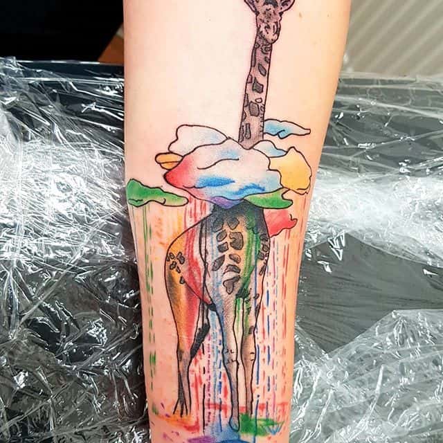 Но также жираф стильно смотрится и в других стилях: графике, акварели, дотворке, в мультяшном виде и др.. Так как животное это уникально, оно будет узнаваемо в любой технике. Часто рисунки с жирафом делают в юморной форме, изображая его, например, в пиджаке или за необычным занятием. Такой вариант выберет человек оригинальный, позитивный и веселый. Разместить на коже такую идею можно где угодно, все зависит от размера рисунка. Продолговатый жираф будет гармонично смотреться на ноге или на руке. Закажите эскиз в салоне Альянс в Киеве.