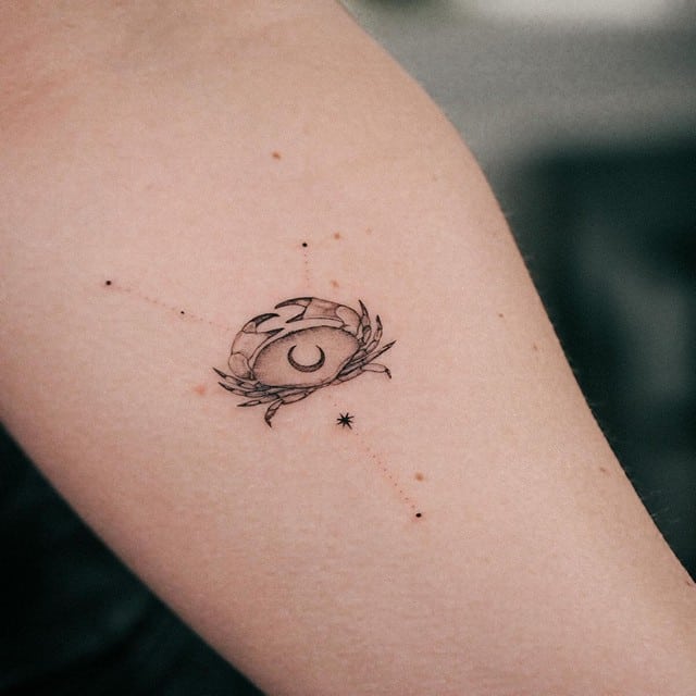 При этом совершенно неважно, что именно вы выберете в качестве татуировки – символ знака Зодиака, надпись Рак, рисунок звездного созвездия – значение будет схожим. Стоит отметить, что при выборе рисунка существа стоит каким-то образом «намекнуть» на зодиакальную принадлежность тату, ведь рак как животное в мире тату имеет другой смысл.