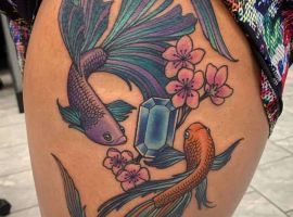 Часто комбинируют изображения знака Рыбы с другими символами. Считается, что так можно увеличить положительное влияние тату на жизнь. К числу таких элементов относится планета Нептун, вода (к примеру, капля, волны), цветы (например, нарцисс, маки, жасмин) или же камни (жемчуг, аметист). Отлично будет смотреться тату Рыбы с различными косметическими элементами: спутниками, метеорами, да и просто вселенной.